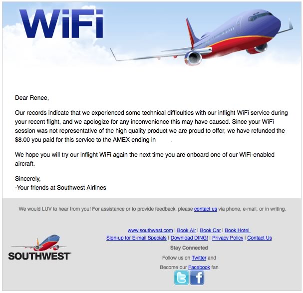 As you can see from the email above, Southwest proactively determined who had paid for WiFi on the flight and reimbursed the charge. It is a great example of proactive service and recovery!